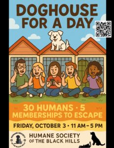 RAPID CITY, SD — The Humane Society of the Black Hills (HSBH) is hosting Doghouse For A Day on Friday, October 3, from 11:00 AM to 5:00 PM at the shelter. The challenge is simple and fun: 30 community participants will spend time in five decked-out kennels, calling and texting friends to secure at least five HSBH memberships each. Once a participant locks in those memberships, they’re “released.” If they don’t make it to five, they can donate toward HSBH’s lifesaving work to get out.
